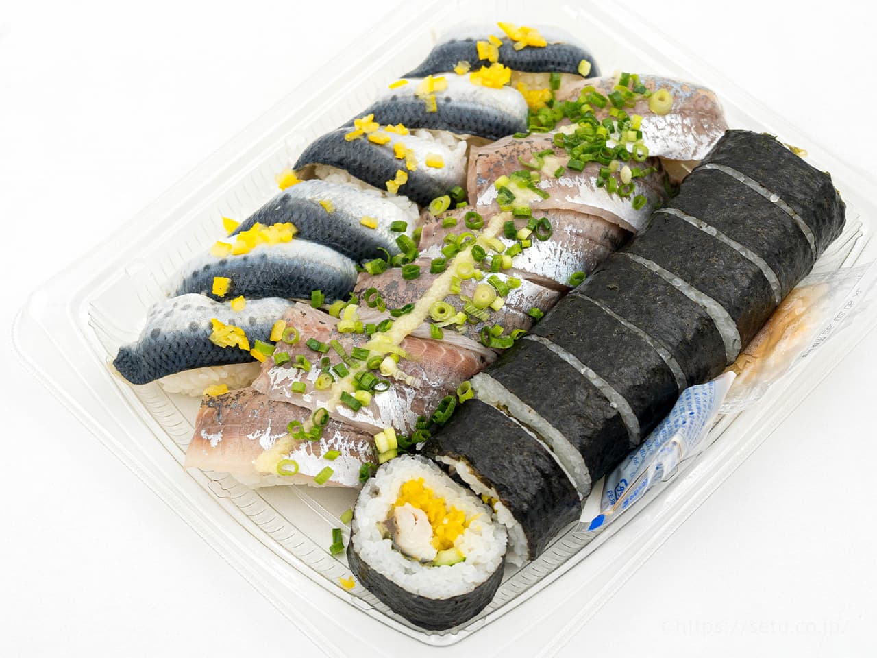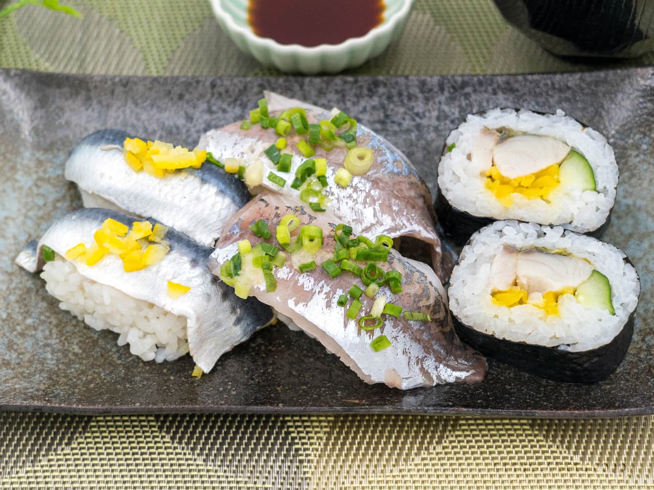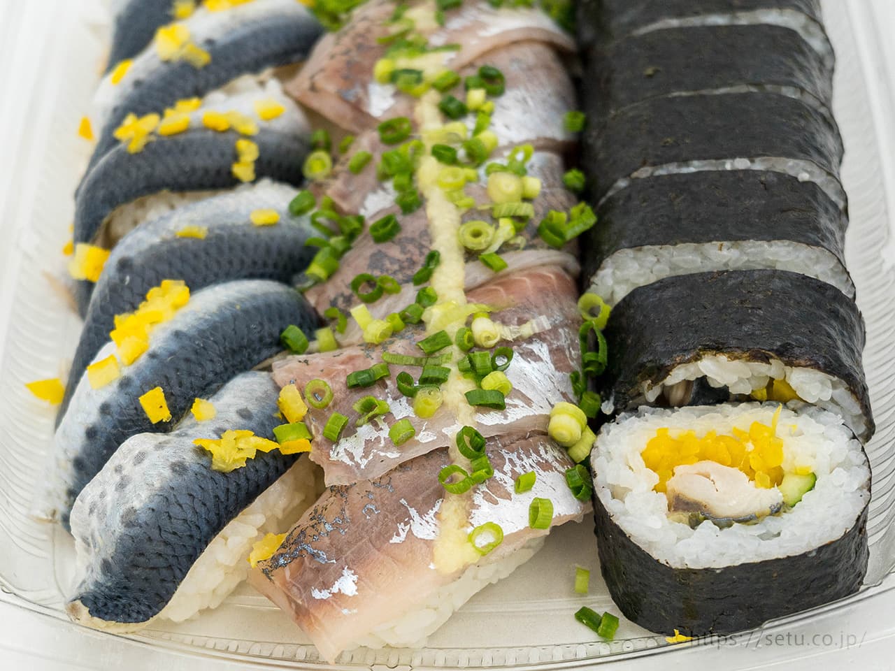 真あじの握り×6巻・酢じめいわしの握り×6巻・しめサバたくあん巻×8切れ