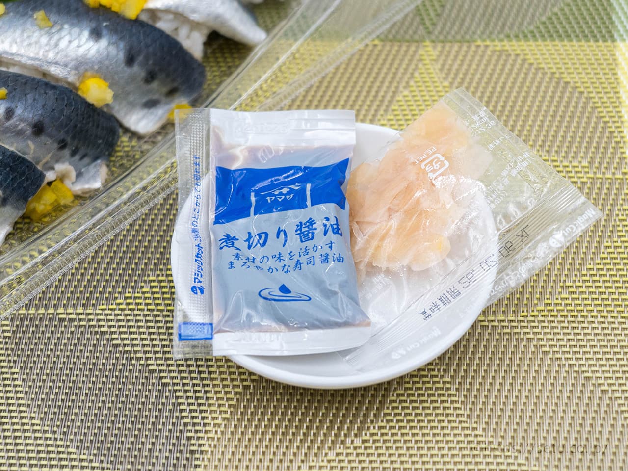 醤油・生姜が入ってましたが、わさびはついてなかったです。薬味がのってるので醤油だけでじゅうぶん美味しくいただけます!