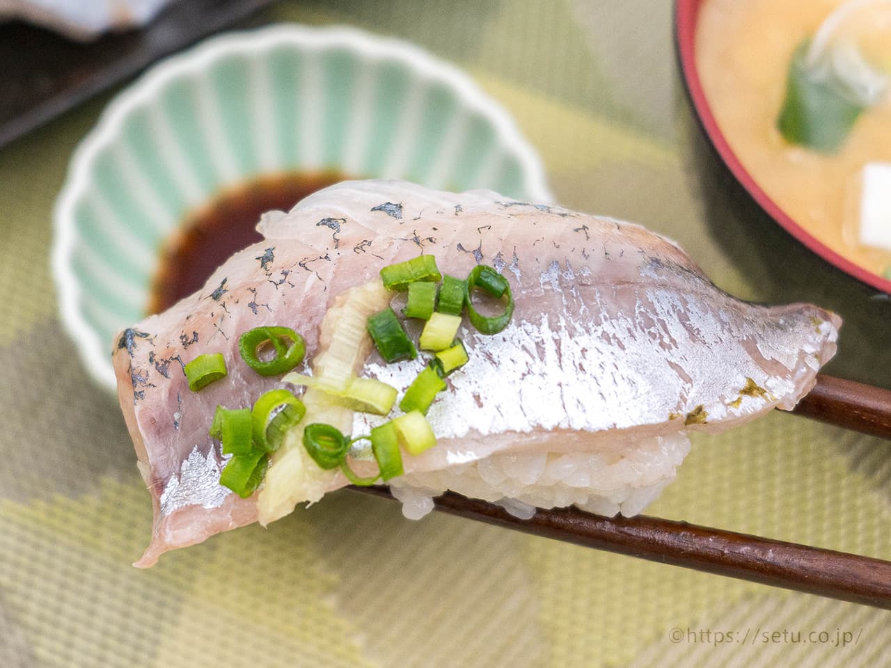 国産真あじに、刻み青葱とおろししょうがをトピング。シャリを包み込むほどの大きさで、厚みもしっかりとしています!
