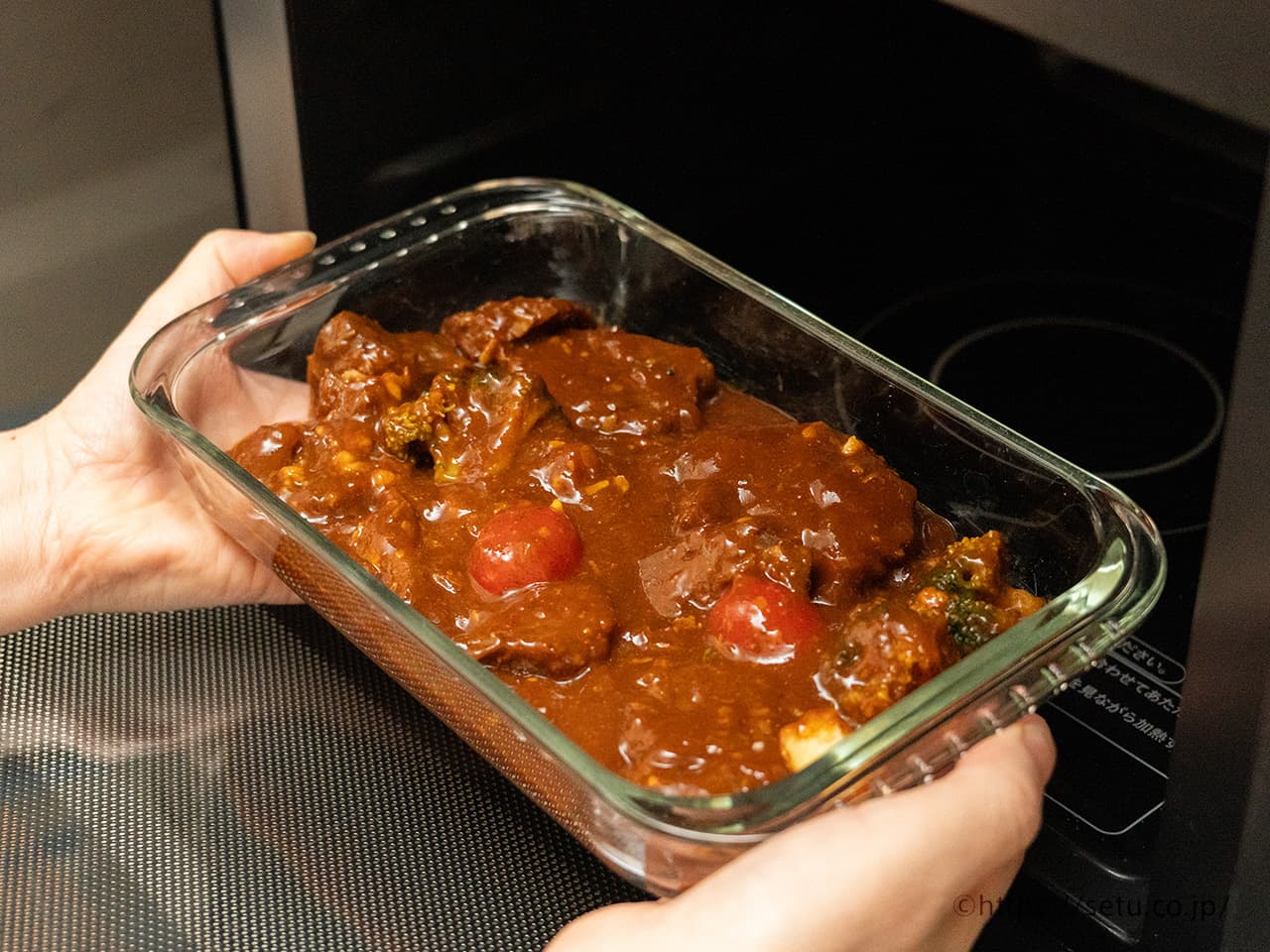 - シチュー・トマト・ブロッコリーを耐熱容器にいれて加熱(500Wで約8分)