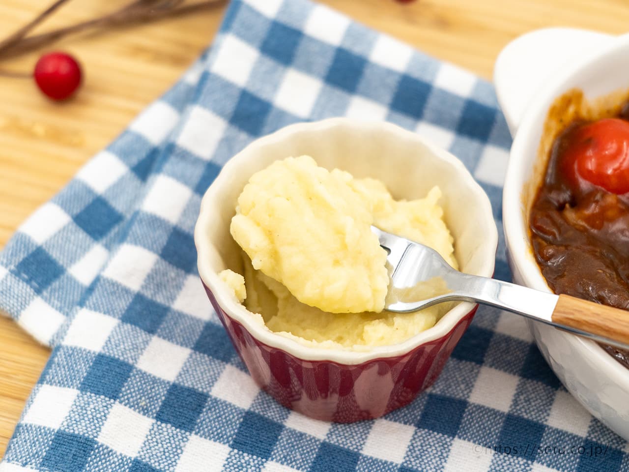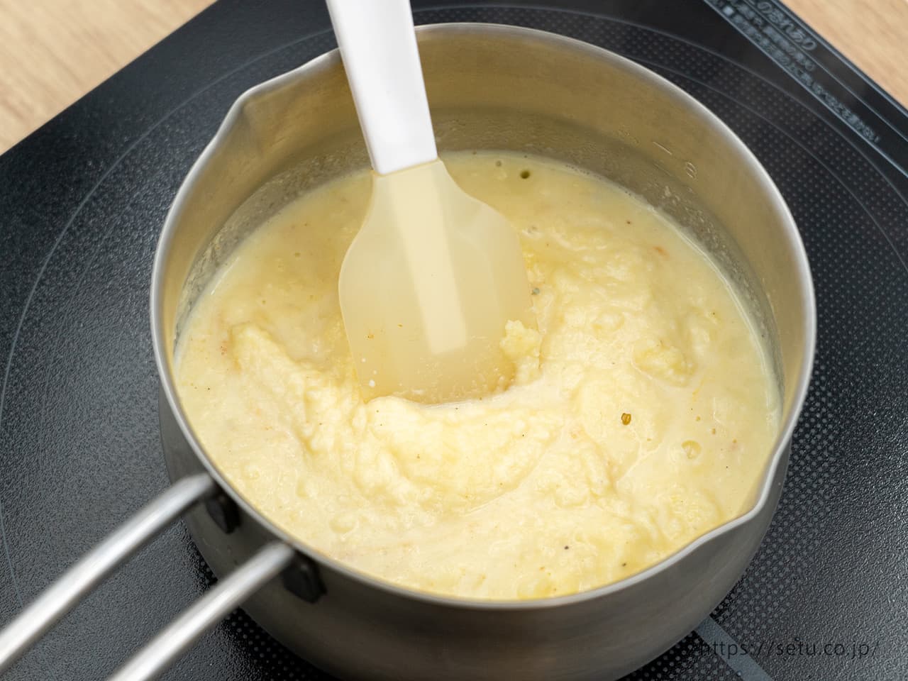 - マッシュポテトを鍋に入れ、水または牛乳80㏄を加えて混ぜながら5分加熱