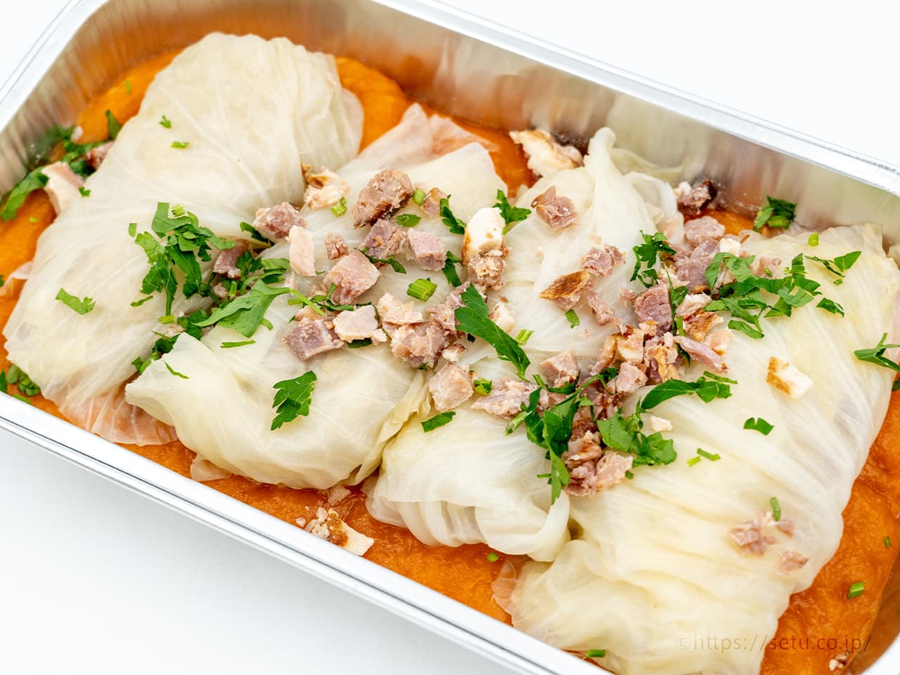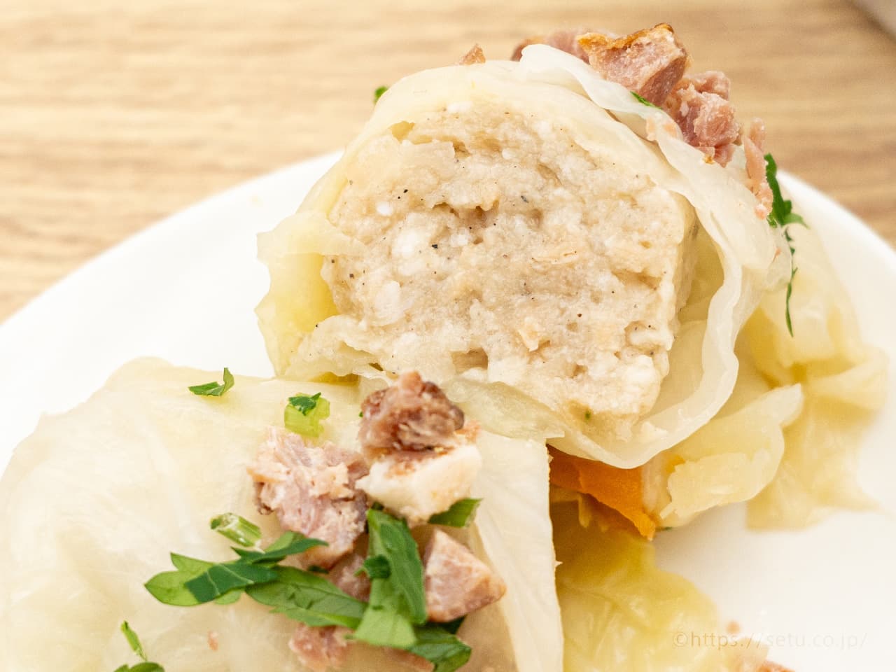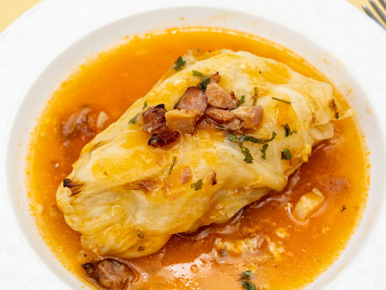 デカロールキャベツが4個、トマトスープの上に鎮座しています。トッピングは、ベーコンとパセリ、見た目はめっちゃ良いです!
