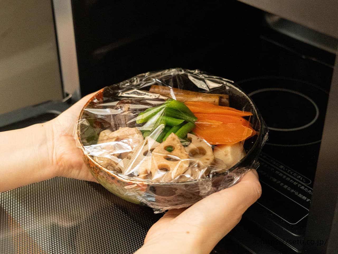 そのままでも食べられますが、温め直すをさらにおいしくなります!耐熱皿に移してラップをしたらレンジで加熱しました。