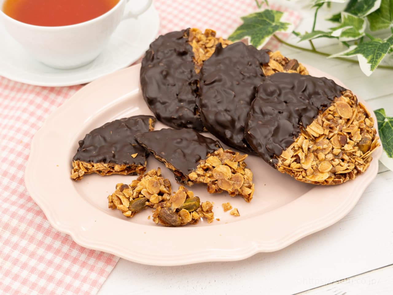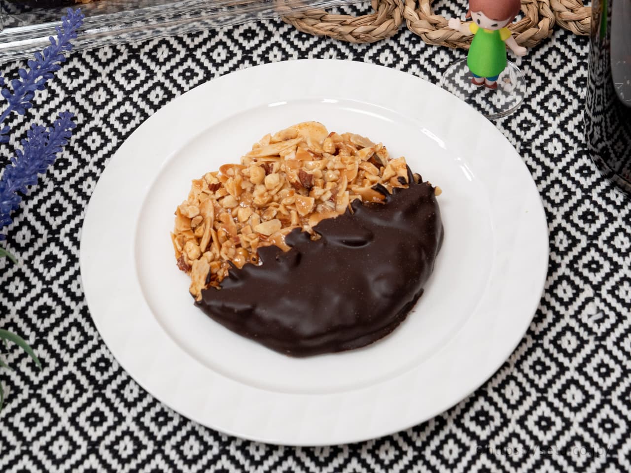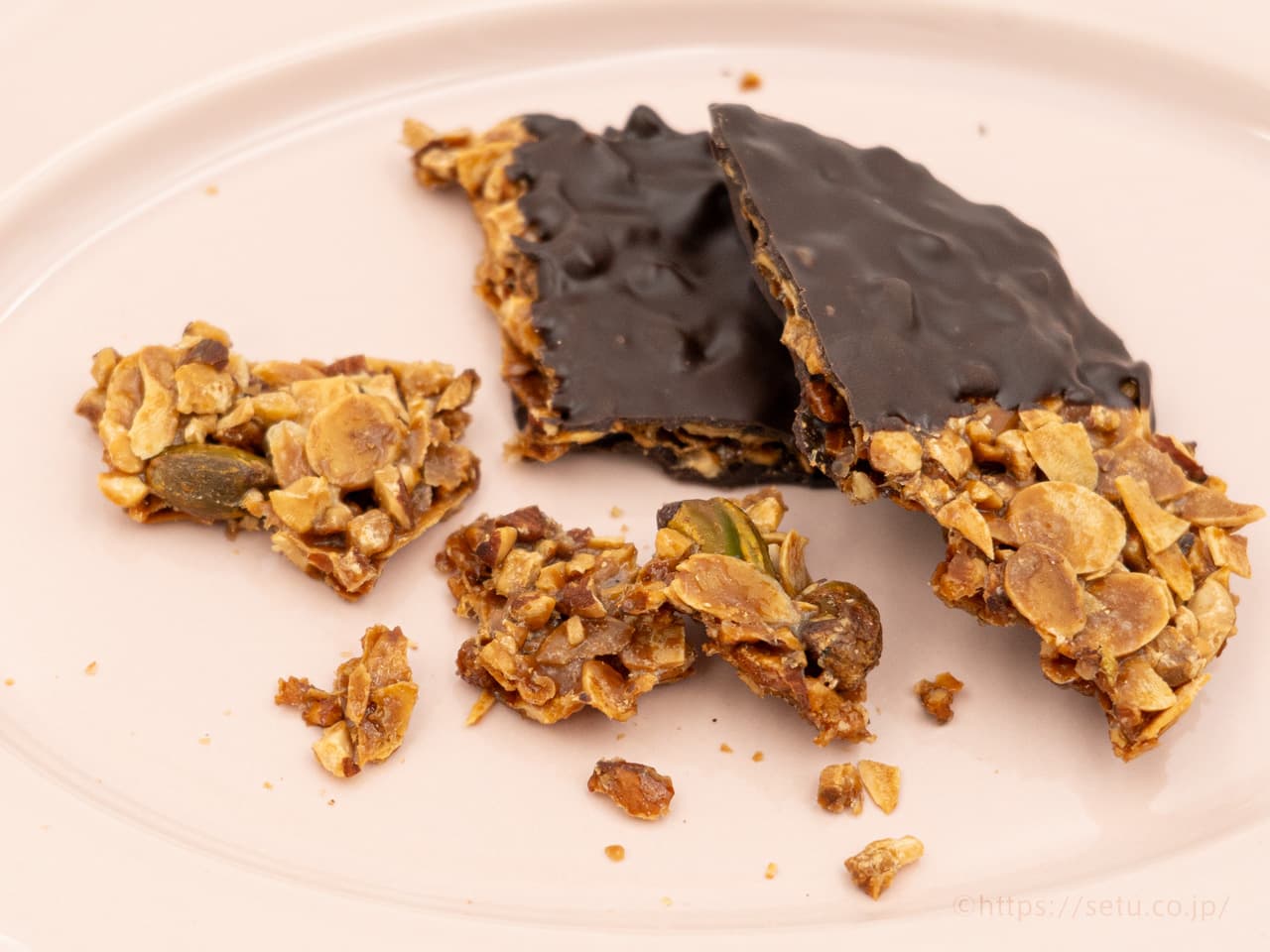 チョコレートは少しビターな印象で、口溶けがいいですねー!ナッツの食感・甘味と相性ばっちりですよ。