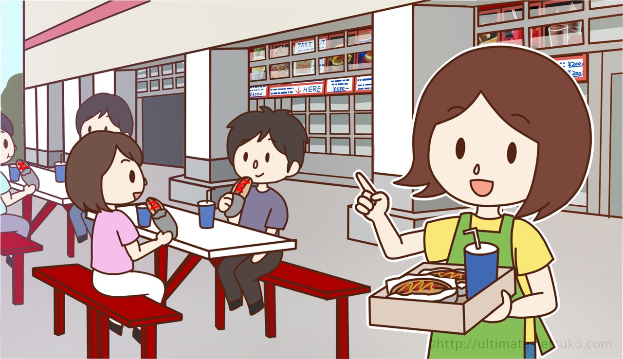 フードコートのメニューはどれもビッグサイズなので、家族や友達とシェアすることも多いです。