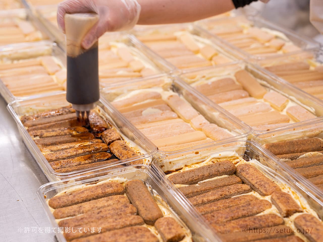 写真はスタッフさんが実際にティラミスにエスプレッソを染みこませているところ。