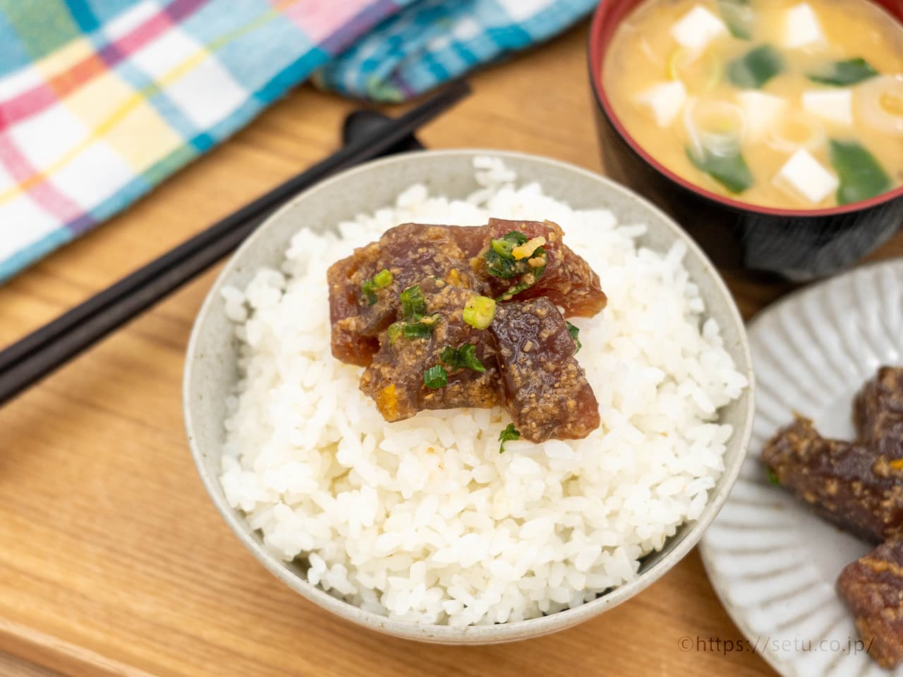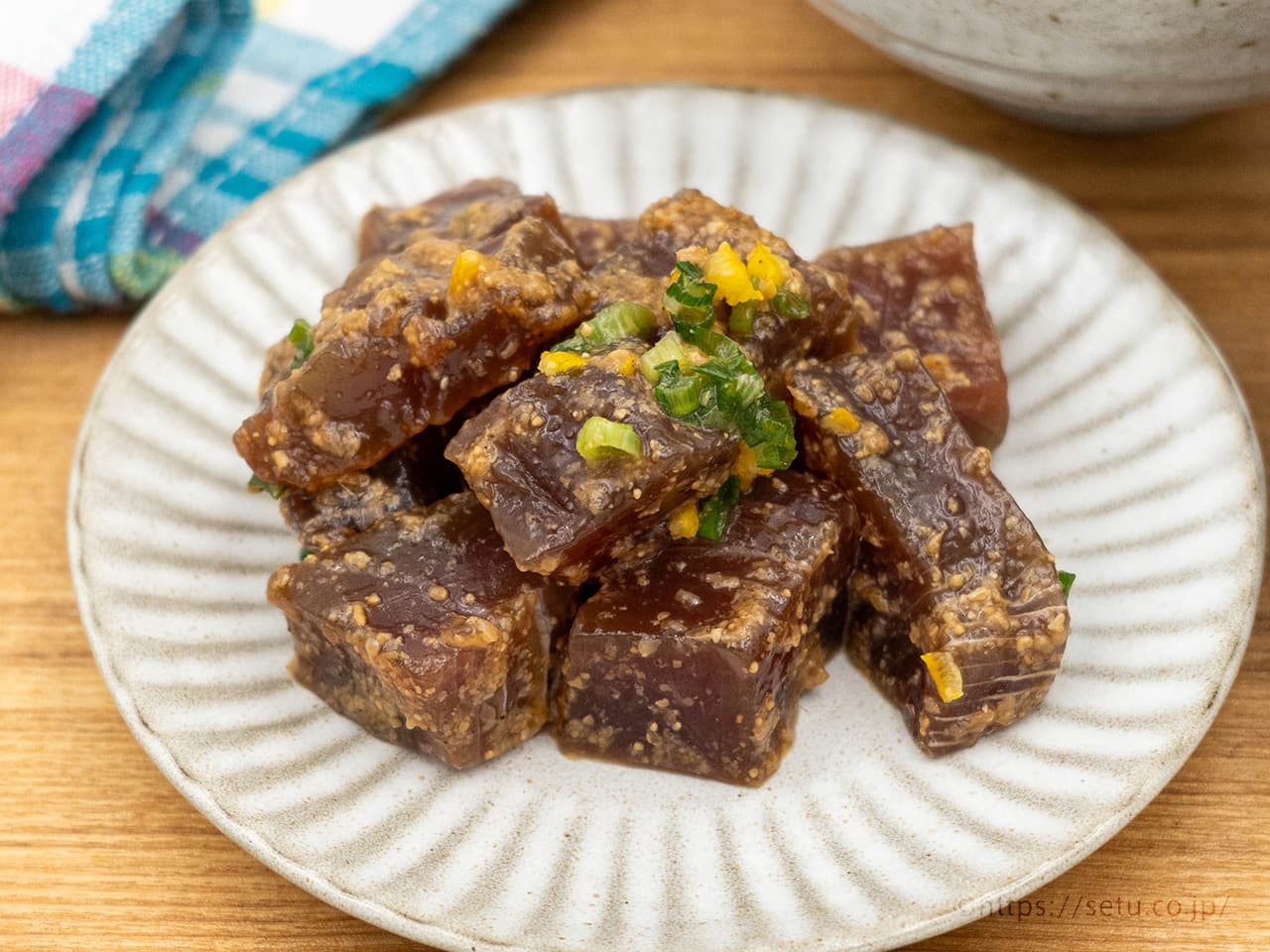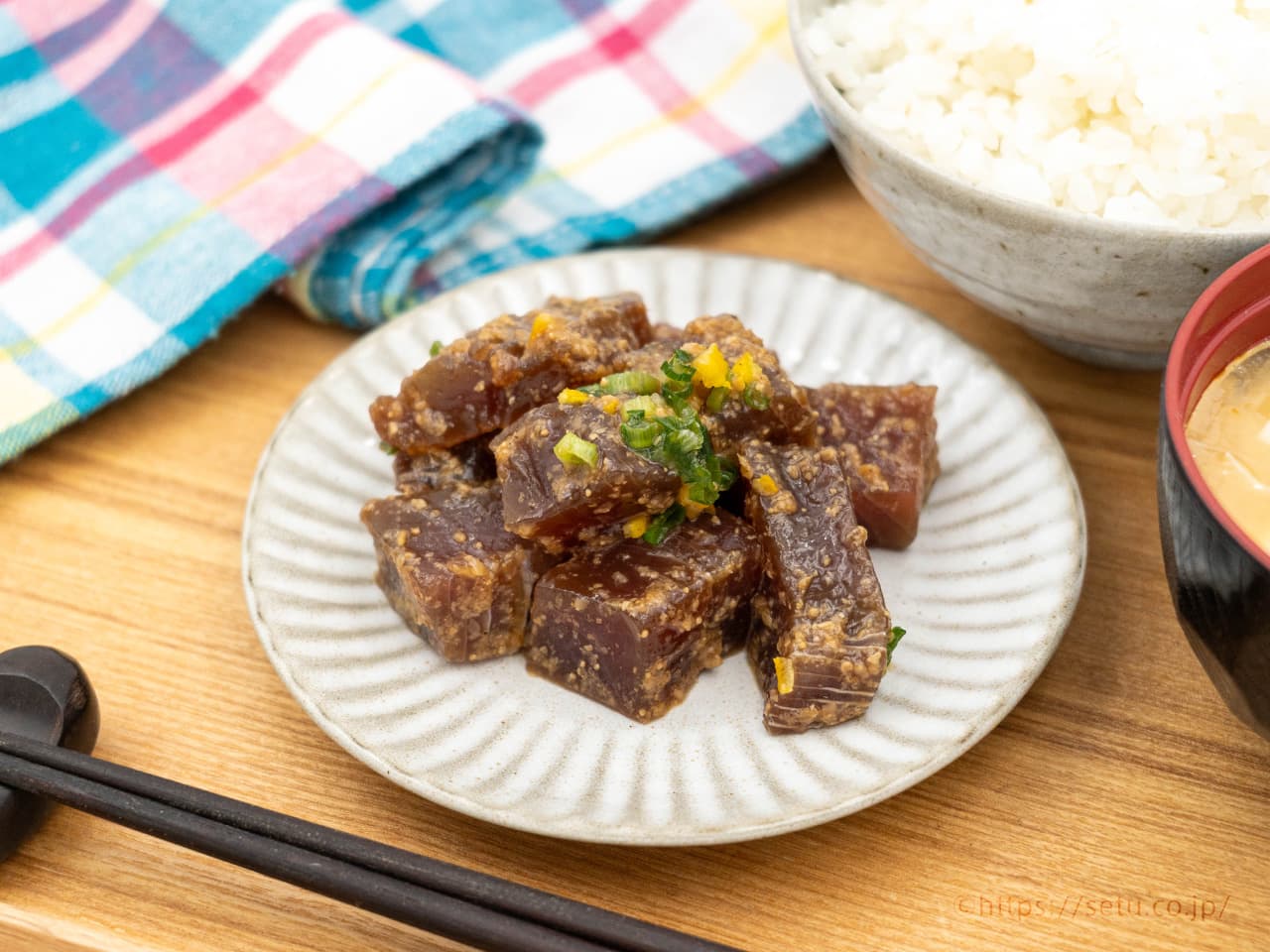 - 脂ののったカツオを醤油・生姜・にんにくで和えたカツオのポキ