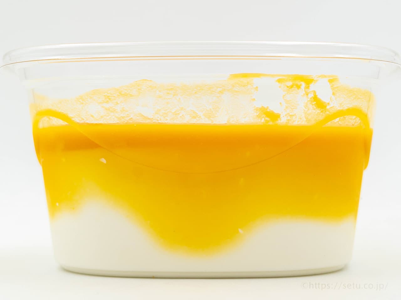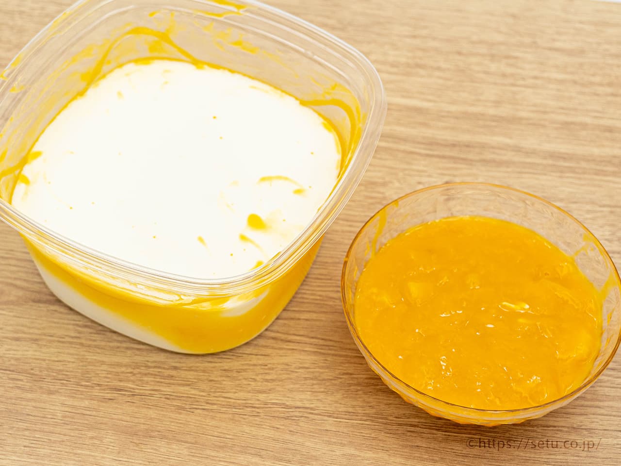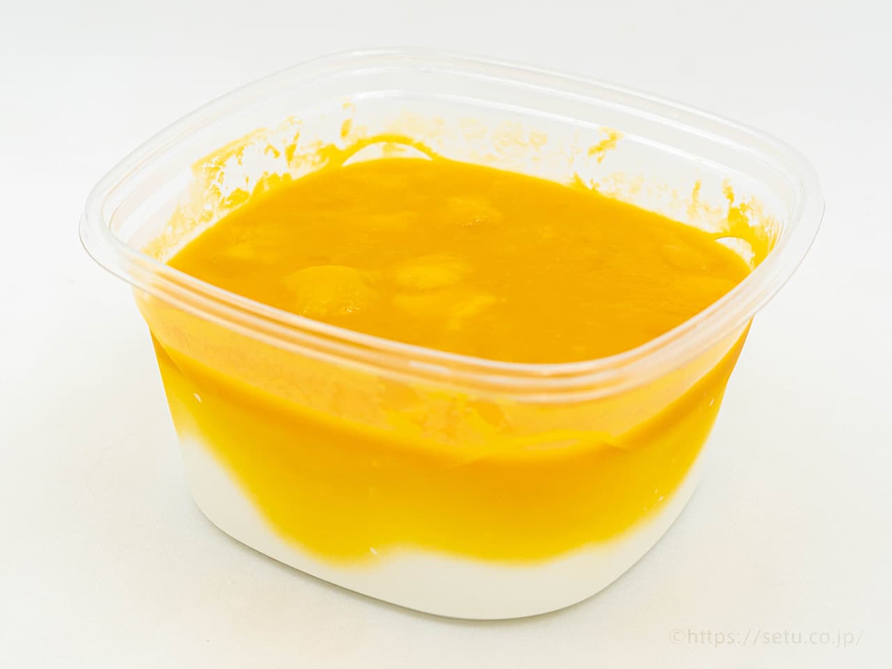 プリンの部分は意外と冷凍してもイケるんですが、果肉ソースの方がしゃびしゃびになって明らかに劣化してしますので、なるべく早く食べきってしまうのがおすすめ。