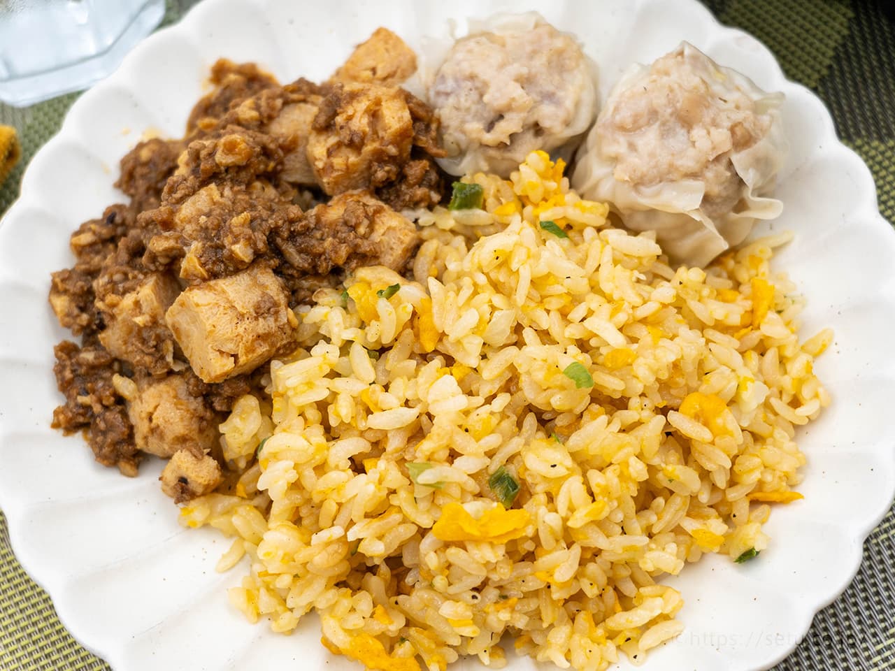 お肉たっぷりな麻婆豆腐に卵とネギのシンプルな炒飯、焼売はジャンボサイズが4個入りで食べ応えがありますよ👌