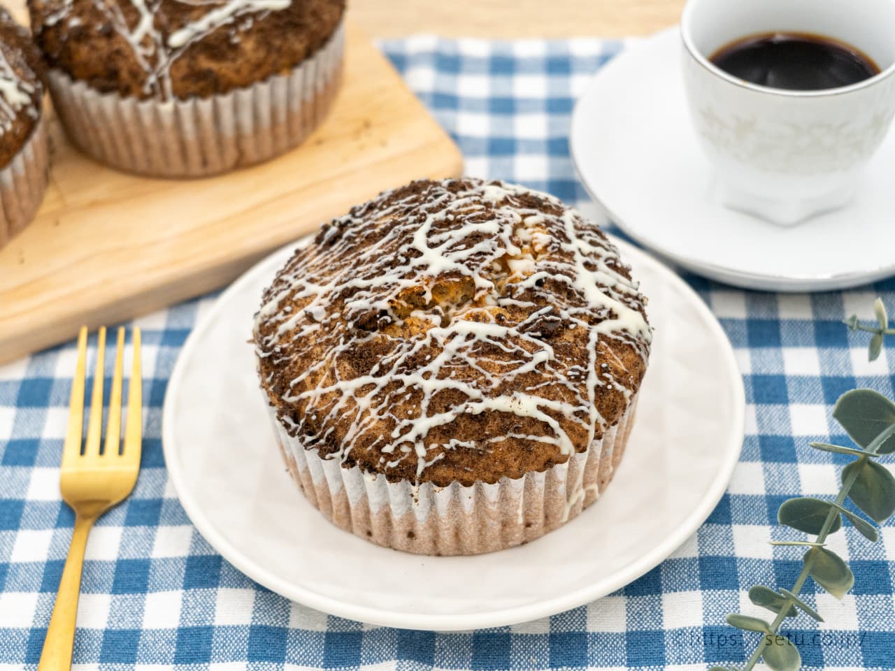 プレーン生地をベースにココアクッキークランブルを贅沢に使用した新作マフィン♪トッピングにホワイトチョコですが、意外にも甘さ控えめで美味しいです