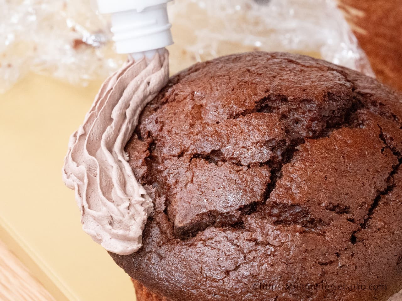 マフィンの上にチョコチップクッキー生地をぬりぬりします。