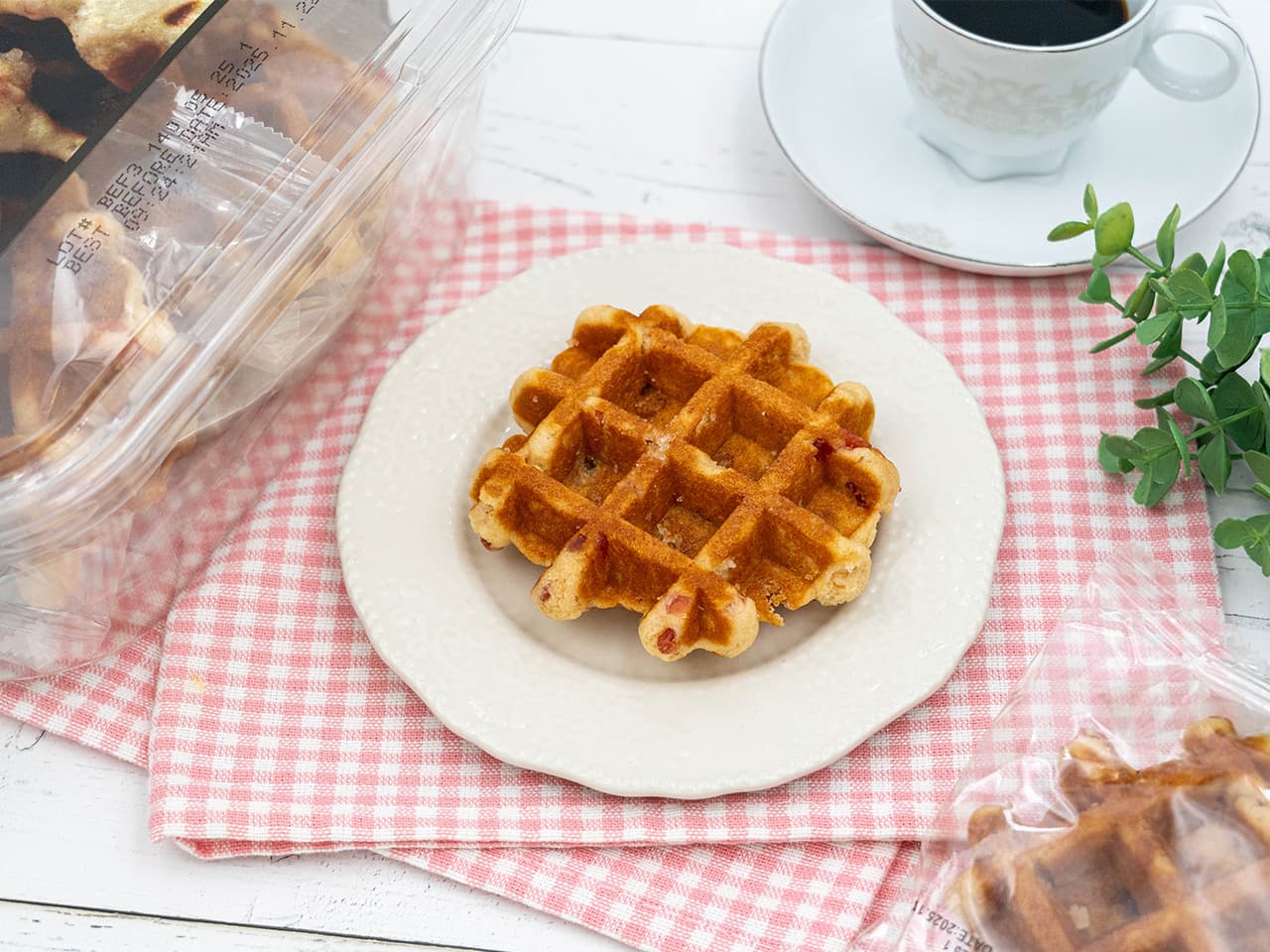 いちごジャムのような甘さがワッフル生地と合います。食べると砂糖のジャリッとした食感もアクセントになってて美味しかった♪