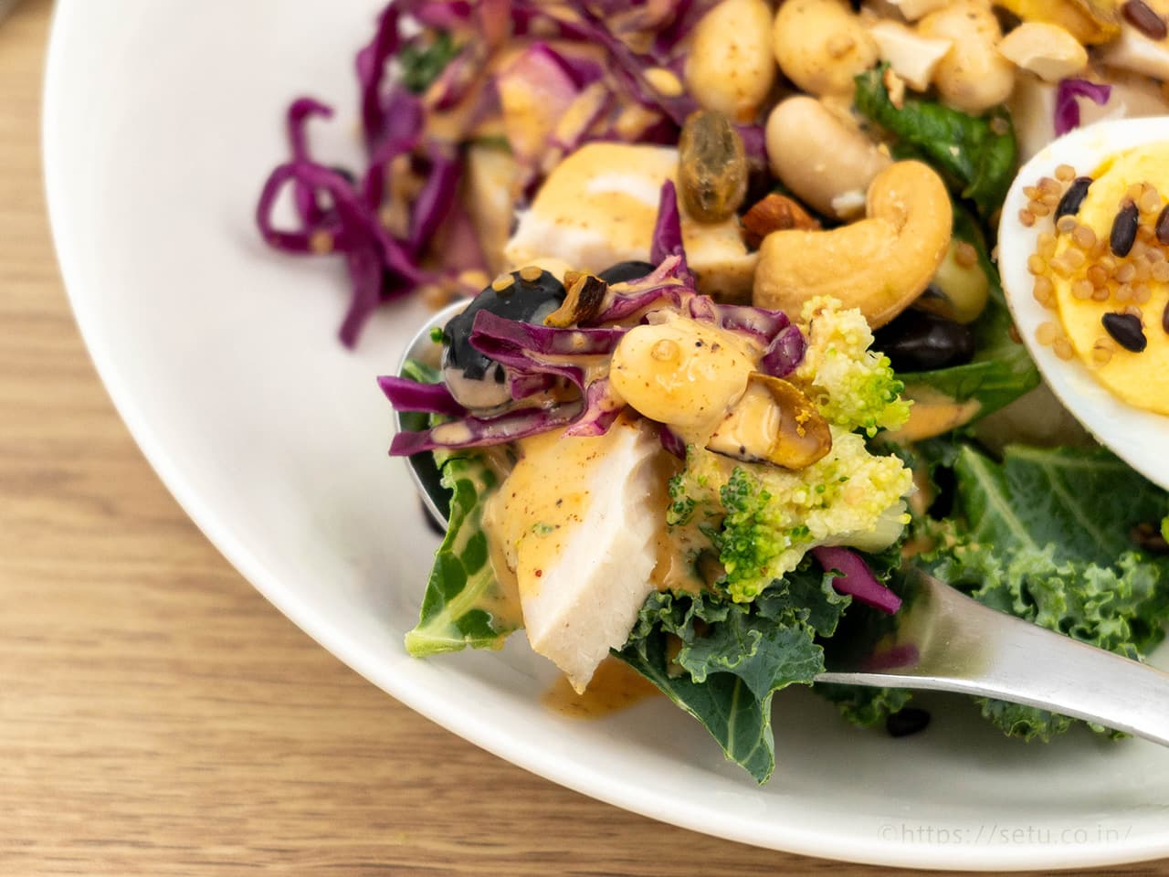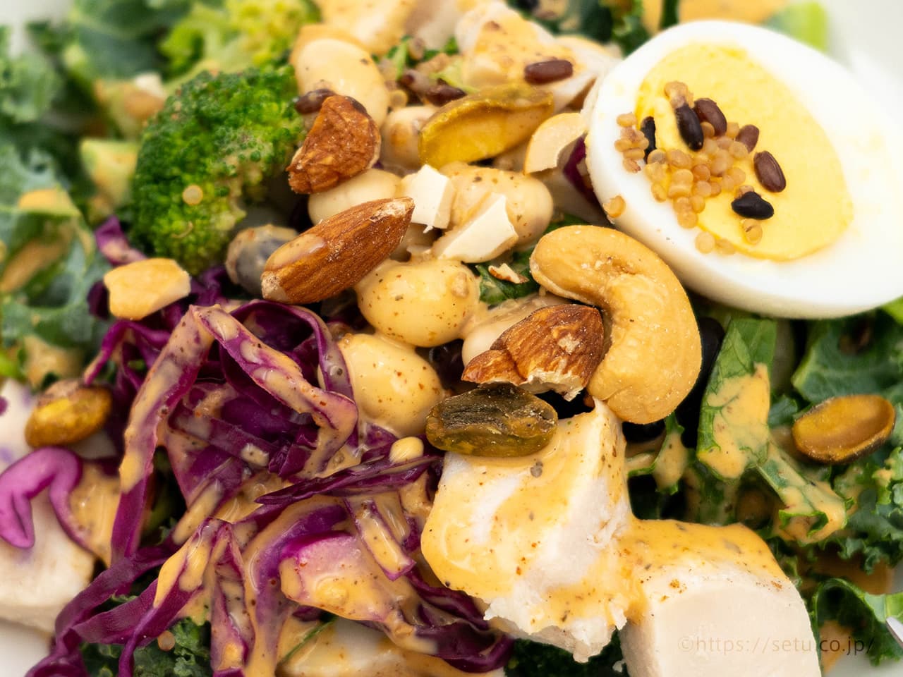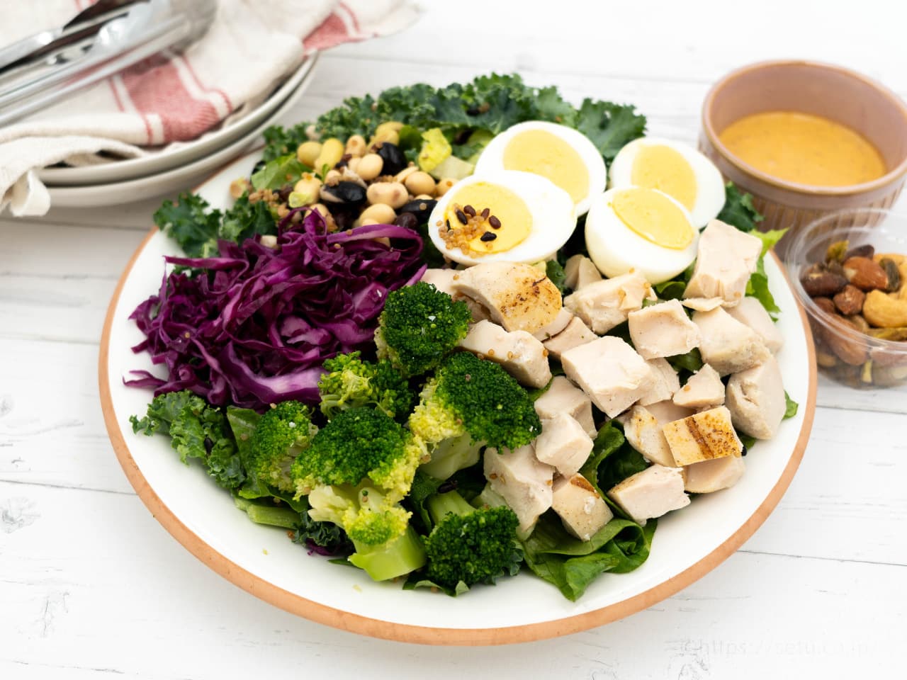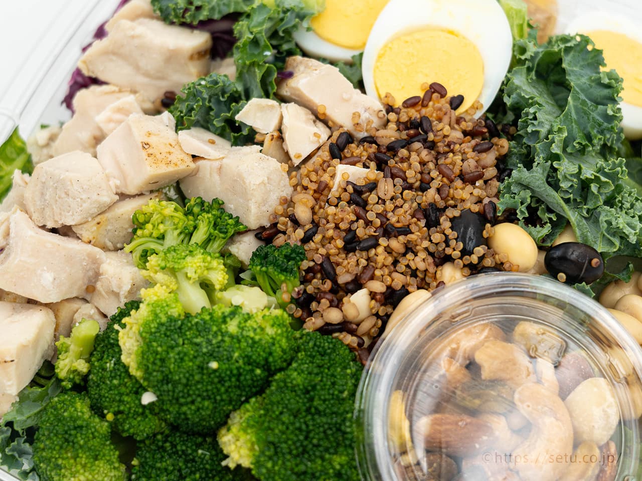 チキンと卵だけでなく、豆類やキヌアなど植物性タンパク質も入っているため、栄養バランスの良いサラダになっています。
