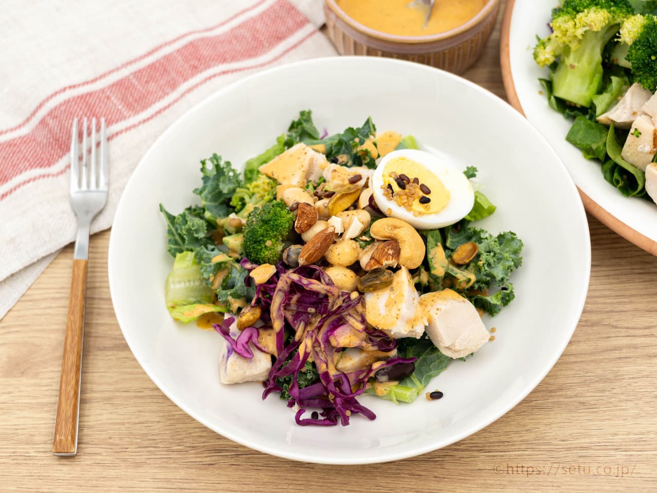 - チキンや卵、ブロッコリーが入った高たんぱくサラダ