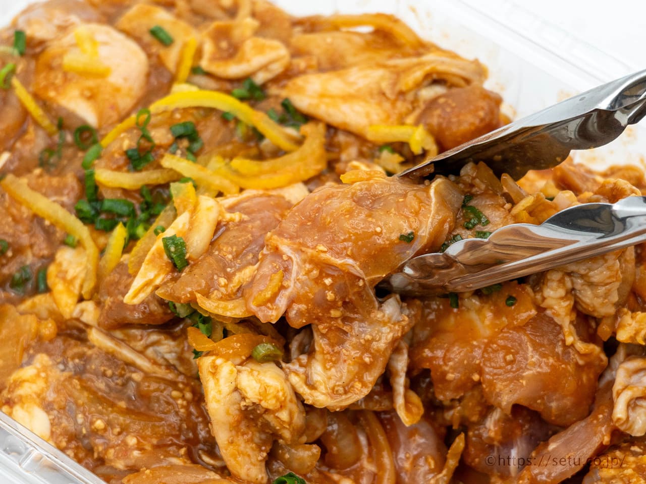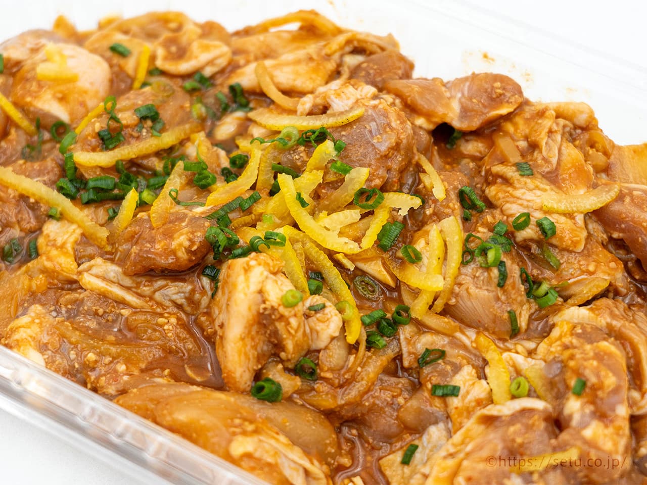 味付けされた鶏もも肉は皮付きで、ひと口大にカット済。ゆずスライスと刻み青葱がトッピングされています!
