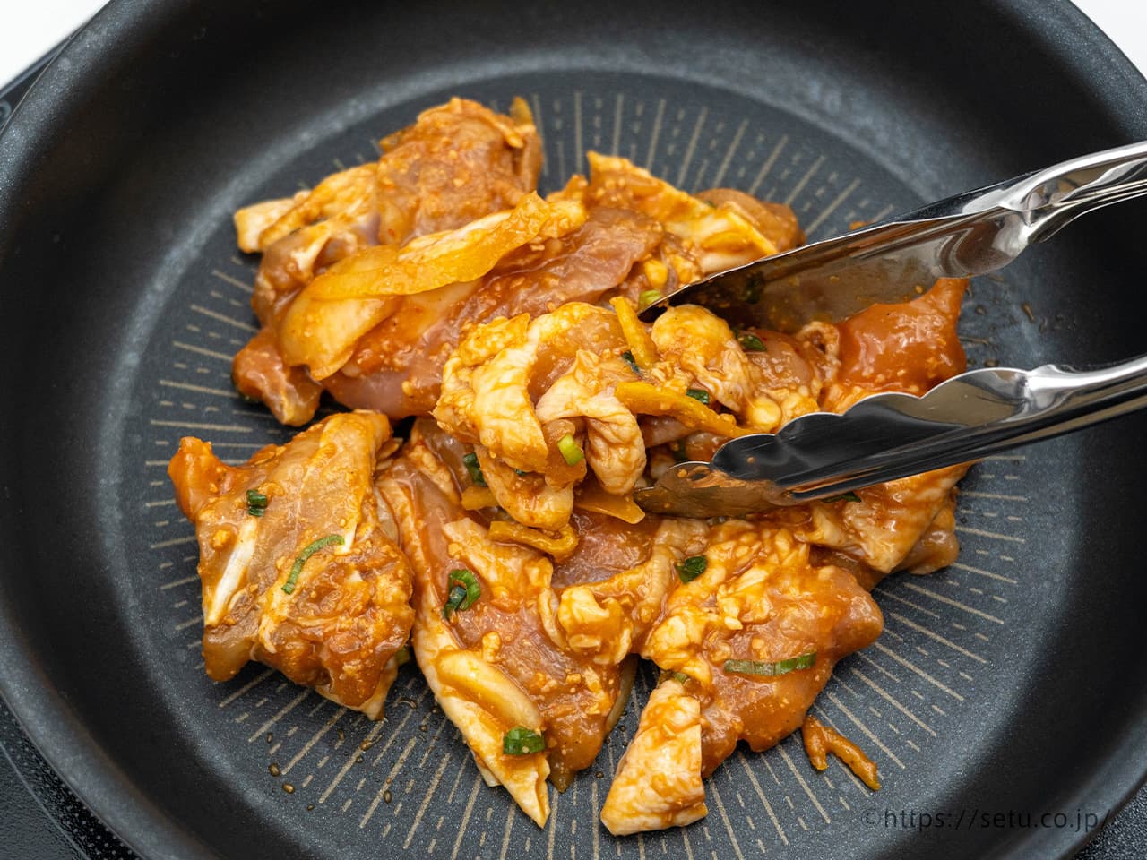 フライパンでしっかり加熱しましょう!鶏肉なので火が通るまでに時間がかかって焦げ付きやすいので気を付けたいですね。