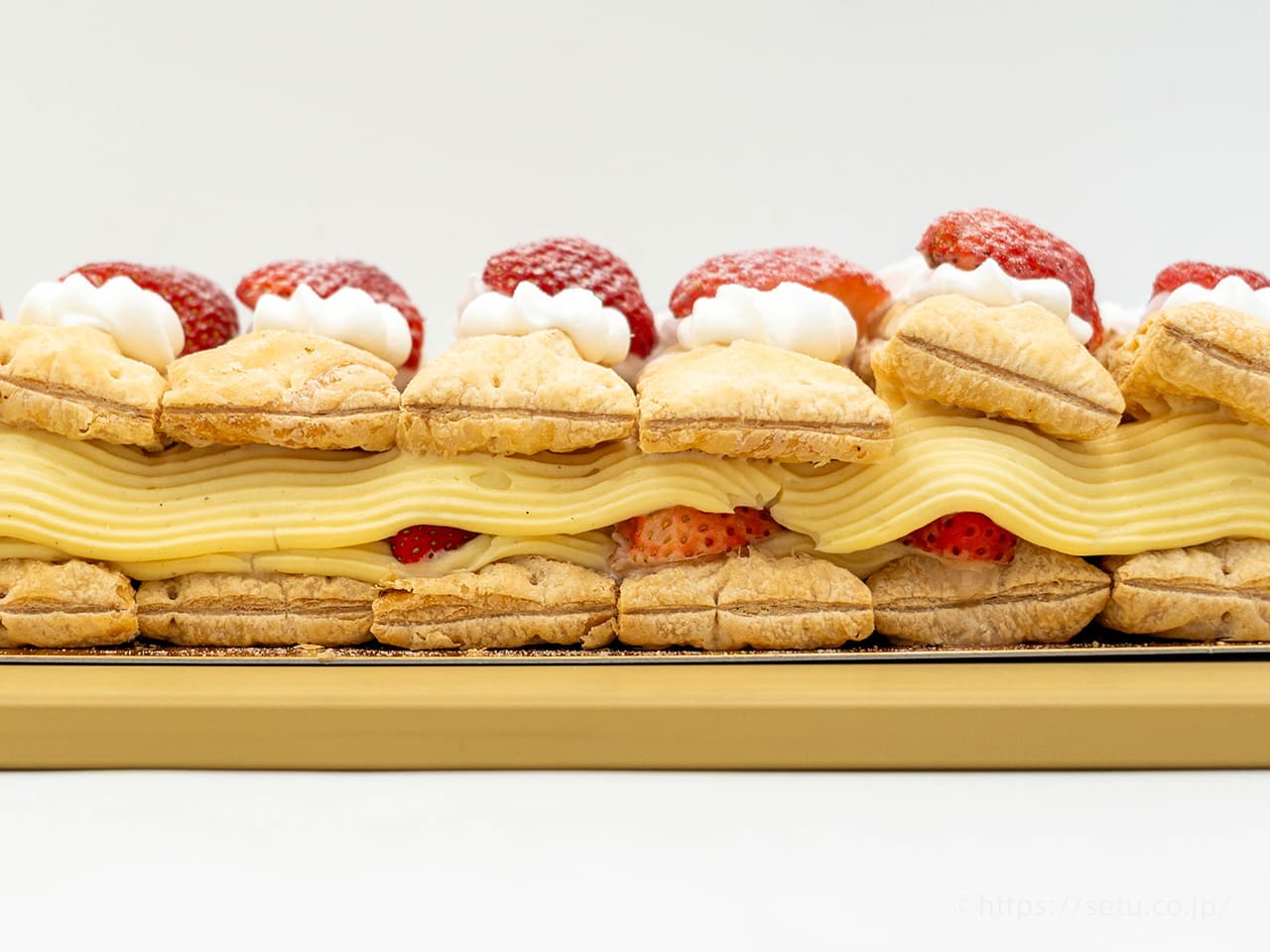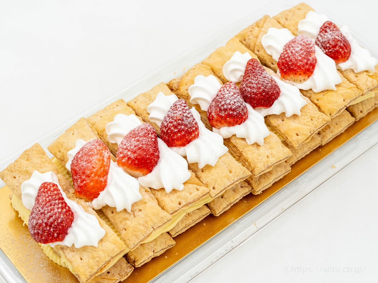 スティック型のパイ生地でカスタードクリームと苺をサンドした、可愛らしいビジュアルが目を引くスイーツです。