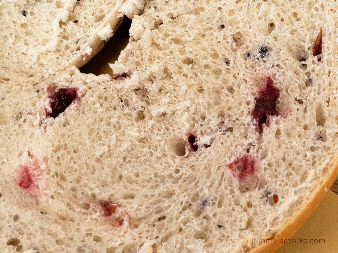 生地全体にブルーベリーとクランベリーが練り込まれています。フルーツ感はそこまで強くないので食べやすいですよ。